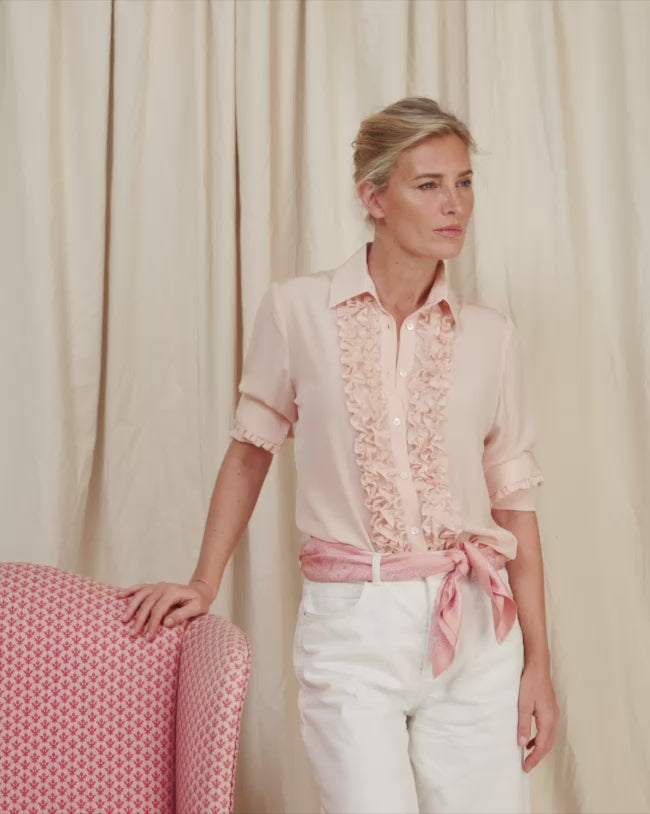 a luxurious women’s pink silk frilled shirt