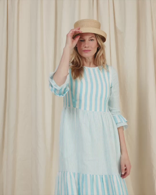 Our Creative Directors love this new flattering style, cut from fresh turquoise and white striped linen, with its flamenco style sleeves giving the wearer a super feminine silhouette