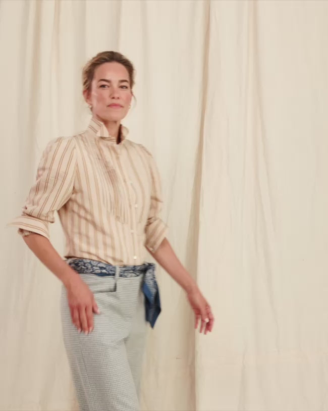 This elegant style, with its puff sleeve, deep cuffs and pin tuck detailing sits beautifully over trousers and skirts or mirror our styling and team with the suede Bonaparte Tailcoat.
